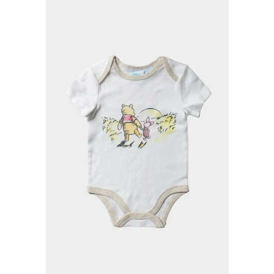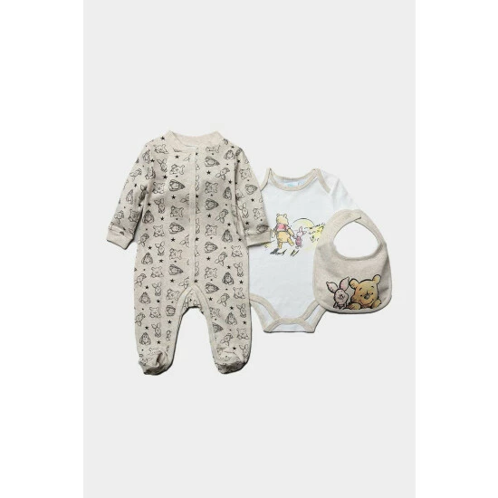 This Disney Baby Winnie the Pooh set is the perfect gift for the little one in your life, this three-piece set features a delicate Winnie the Pooh print and details. It includes a short-sleeved body suit with popper fastenings, a long sleeve sleepsuit, and an adorable bib. It makes a perfect going-home outfit or baby shower gift. On the sleepsuit you will find Winnie, Piglet, Tigger and Eeyore.