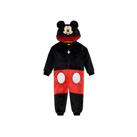 Boys Disney Mickey Mouse Onesie. Oh Boy! Hop into these cosy Mickey Mouse pyjamas and dream of magical Disney adventures all night long! Crafted in a super-soft polyester, this red and black sleepsuit mimicks Mickey’s iconic style. Completed by a warm lined hood featuring MIckey’s embroidered face and 3D signature ears, this all-in-one pyjama is a must-have for any Disney manaic!