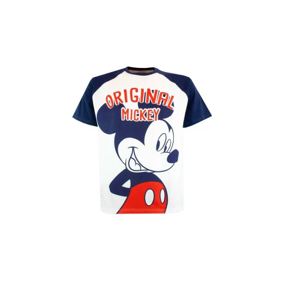 Mens Mickey Mouse Pyjamas. Enjoy Disney film nights in this iconic sleepwear! The white pyjama tee has contrasting navy short sleeves and showcases a print of Mickey with the slogan ‘Original Mickey’. Paired with red plaid pj bottoms with an elastic waistband and navy ankle cuffs. Must-have pyjamas for Mickey Mouse fans!