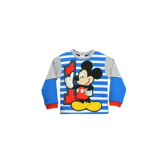 Kids Mickey Mouse Pyjamas. These soft cotton PJs are perfect for any Mickey fans! The set includes a long-sleeved top and full length trousers. The top with half grey and half blue sleeves features bright graphics of Mickey on a blue and white stripe background complete with red ‘1’ detailing. The full trousers have an all-over Mickey print, red cuffed bottoms and an elasticated waistband for a comfortable night’s sleep.