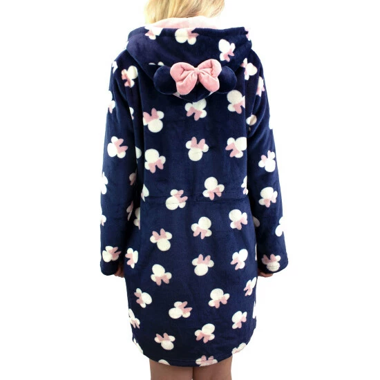 This navy fleece dressing gown for women features Minnie Mouse with her iconic silhouette printed all over. The super soft hood has an adorable 3D detail of Minnie Mouse ears and a bow, just like her signature look. With a drawstring waist with pom-poms and a zip through front for comfort.