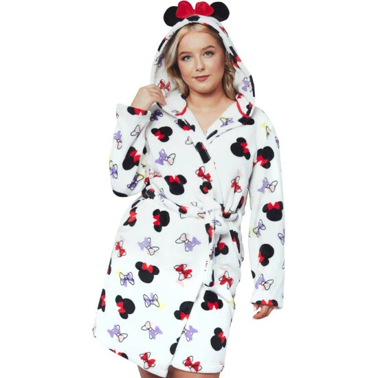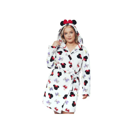 This white Disney Minnie Mouse dressing gown for adults features a Minnie Mouse motif print and a tie belt fastening. This is the perfect ladies dressing gown for cosy evenings. For ultimate comfort this ladies Minnie bathrobe also has a hood with classic Minnie ears and bow detail.