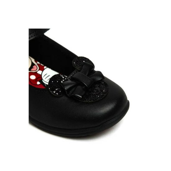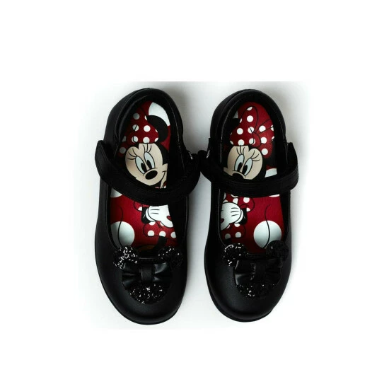 Adorable Minnie Mouse shoes for school. These black PU pumps are a perfect match to your little one’s school uniform! Features a cute print of Minnie on the insoles. These closed toe shoes have a velcro T-bar for comfort and lovely Minnie Mouse bows in 3D with glitter detail. Little ones who love Minnie Mouse will love these for back to school.
