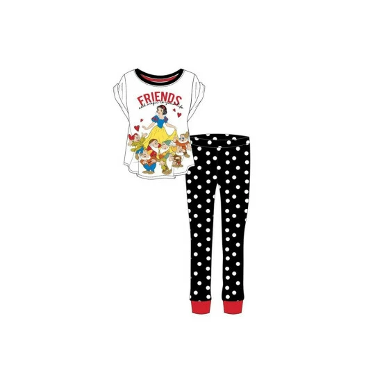 100% Cotton. Elasticated waistline. Short-sleeved top with a contrast round neck. Design features a Snow White and the Severn Dwarfs illustration, `Friends Add Magic To Your Life` text, and polka dot bottoms. Officially licensed. Wash at 40