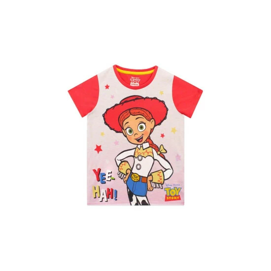 Girls Toy Story Short Pyjama Set. Yee-ha! Get ready for Woody’s Roundup in these rootin’-tootin’ Jessie pyjamas! This pink pyjama top has contrasting red sleeves and features the coolest cowgirl around Jessie against a background of stars, with the colourful slogan ‘Yee-Hah!’ and the Toy Story logo! Complete with cow print shorts with an elasticated waist for a cosy fit. Your little one will be rodeo ready in these awesome short Disney pyjamas!